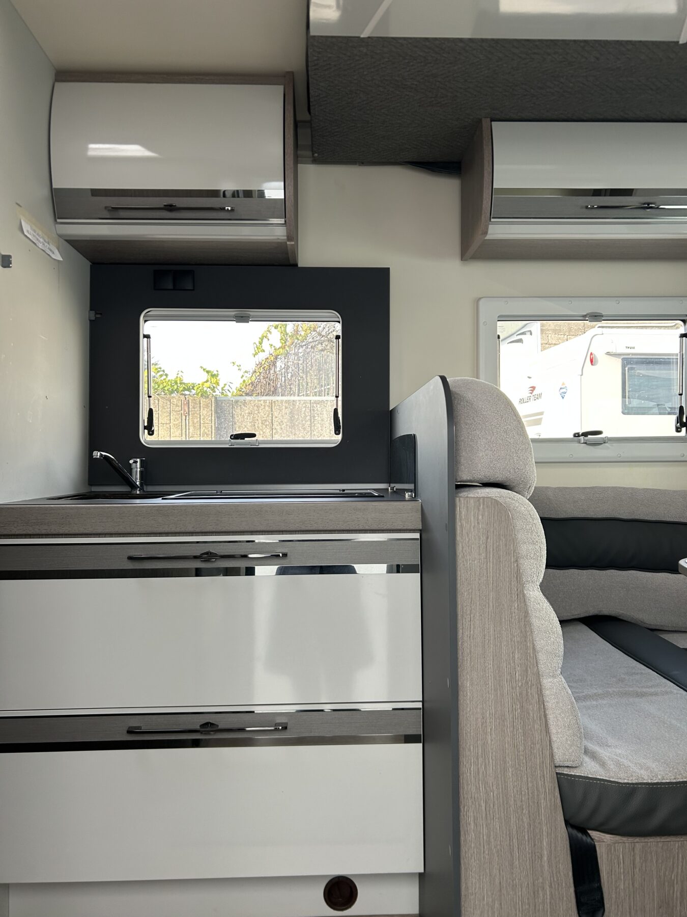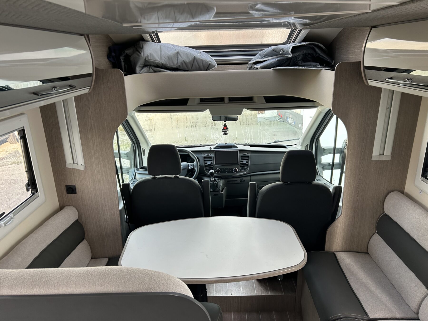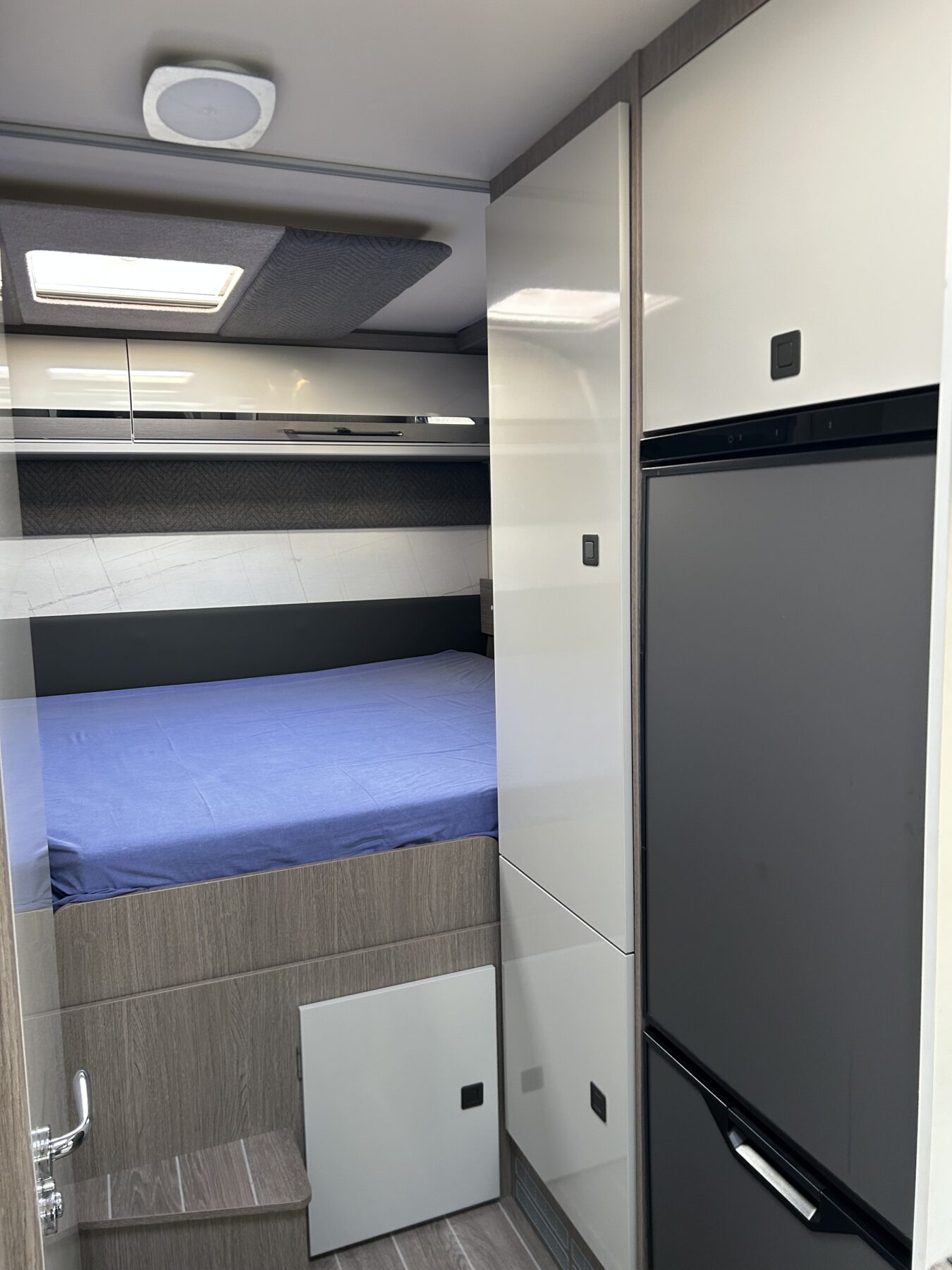 LETTO TRASVERSALE POSTERIORE SALI/SCENDI, AMPIO GAVONE POSTERIORE (Ingresso 120cm), BAGNO CON DOCCIA, AMPIA ZONA GIORNO CON LETTO BASCULANTE CHE LASCIA LIBERA LA PORTA D’INGRESSO. LUNGHEZZA 6.99CM